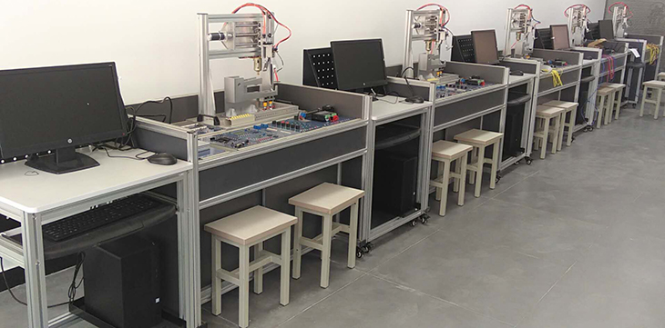 單片機控制功能實訓考核裝置采用烤漆鋼板制作的臺式結(jié)構(gòu)。實訓臺的抽屜柜用于存放實訓模塊,抽屜柜與臺面之間布置實訓模塊安裝支架,最上一層是工作臺臺面。用于技能競賽時在臺面上放置設備安裝底板,在底板上安裝試題擬定的單片機控制裝置需要的模塊,連接控制電路,編寫的控制程序輸入單片機后,按下運行指令開關(guān),單片機控制裝置就按程序運行。