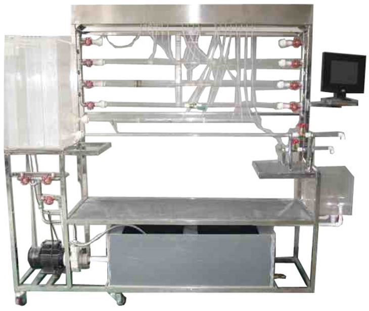 雷諾實驗管、伯努利實驗管、沿程阻力管、局部阻力管、水泵、秒表、玻璃溫度計、測壓計、刻度標尺、文丘里流量計、實驗水箱、計量水箱、蓄水箱、指示液盒、不銹鋼框架。