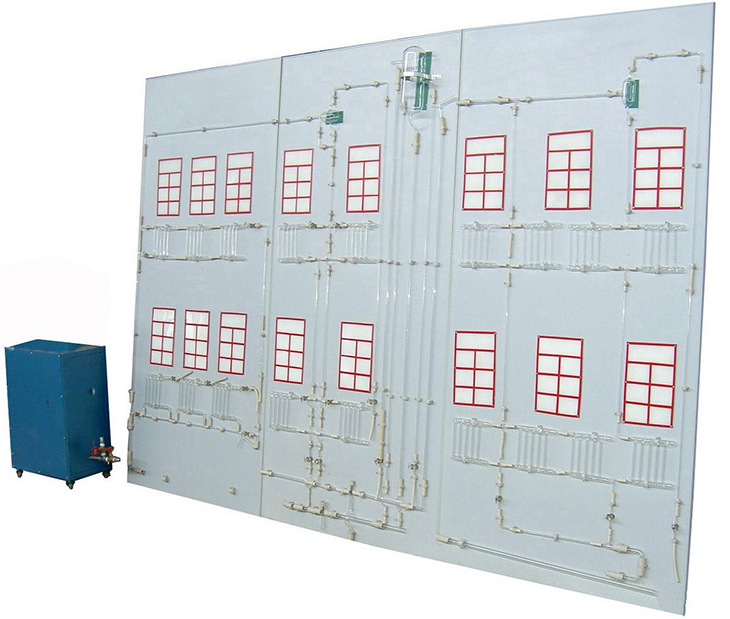 模擬采暖散熱器片、采暖供水干支管道、回水干支管道、集氣罐、高位膨脹水箱、溢水管、信號管、循環(huán)管、排水管、膨脹管、模擬房間墻面、模擬供暖鍋爐、供水泵、供水箱、實(shí)驗(yàn)臺框架等。