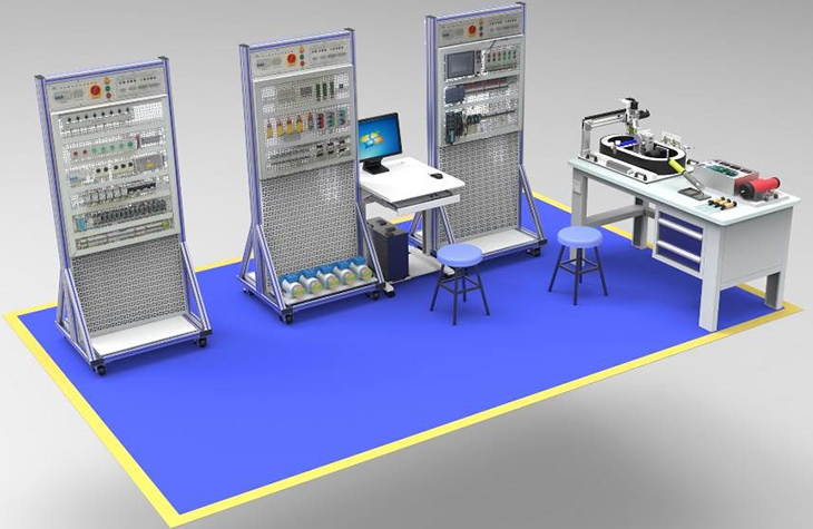1.2平臺采用立式結(jié)構(gòu)開放式設計,主體采用 40*80 型材做骨架,周邊采用 Q235 冷扎鋼板做封板,表面靜電噴塑處理,整機既堅固耐用,又美觀大方。底部裝有帶腳墊萬向輪,萬向輪移動時用,可調(diào)腳固定時用,移動固定兩相宜。頂部安裝電源模塊,中部為實訓區(qū)域,依據(jù)任務安裝不同掛板。