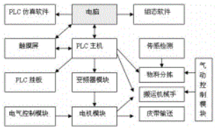 光機(jī)電一體化實(shí)訓(xùn)裝置由型材導(dǎo)軌式實(shí)訓(xùn)臺(tái),典型機(jī)電一體化設(shè)備機(jī)械部件,PLC模塊,變頻器模塊,按鈕模塊,電源模塊,低壓電器模塊,模擬生產(chǎn)設(shè)備實(shí)訓(xùn)模塊(包含上料機(jī)構(gòu),搬運(yùn)機(jī)械手,皮帶輸送線(xiàn),物件分揀等)接線(xiàn)端子排,各種傳感器,警示燈和氣動(dòng)電磁閥等組成。整體結(jié)構(gòu)采用開(kāi)放式和拆裝式設(shè)計(jì),學(xué)生可以組裝,接線(xiàn),編程和調(diào)試由上料機(jī)構(gòu),搬運(yùn)機(jī)械手機(jī)構(gòu),皮帶輸送線(xiàn)和物料分揀組成的光機(jī)電一體化設(shè)備。裝置的總體結(jié)構(gòu)示意圖如圖主所示。
