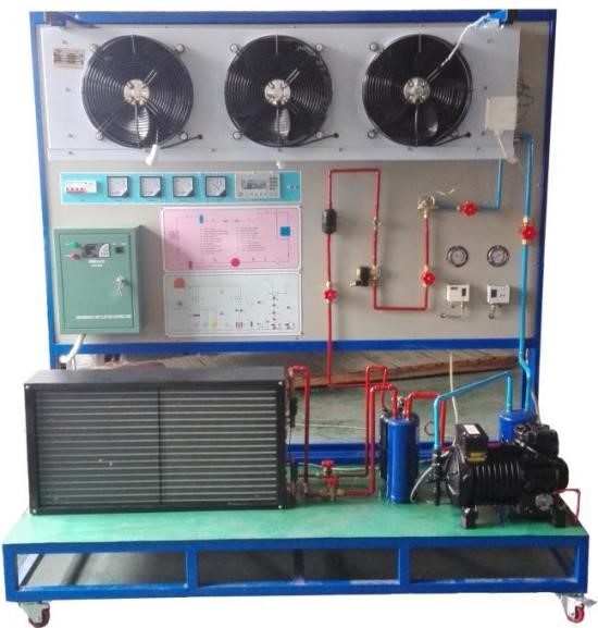 工業(yè)制冷系統(tǒng)實(shí)訓(xùn)考核裝置主要由半封閉式制冷壓縮機(jī)、冷凝器、蒸發(fā)器、膨脹閥和故障設(shè)置開關(guān)、測試儀表等組成。實(shí)訓(xùn)臺(tái)通過手閥開關(guān)和鈕子開關(guān)分別來設(shè)置管路系統(tǒng)和電控系統(tǒng)的 20 多種故障。設(shè)備采用先進(jìn)的電控系統(tǒng)并具有具有開相,缺相, 過流等保護(hù)功能。蒸發(fā)器風(fēng)扇采用變頻器控制速度。配備 8 路溫度計(jì),電壓表,電流表,功率表,功率因數(shù)表和壓力表,能實(shí)時(shí)觀察運(yùn)行參數(shù)