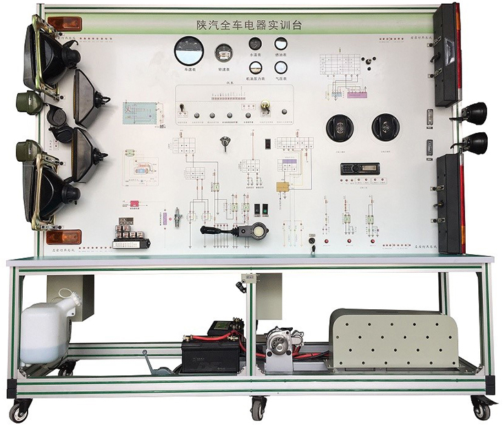 全車電器電路實訓設備采用陜汽SX2220柴油機整車電器實物為基礎,充分展示汽車儀表系統、燈光系統、雨刮系統、喇叭系統、發(fā)動機電器系統、起動系統和充電系統等汽車電器各系統的組成結構和工作過程。