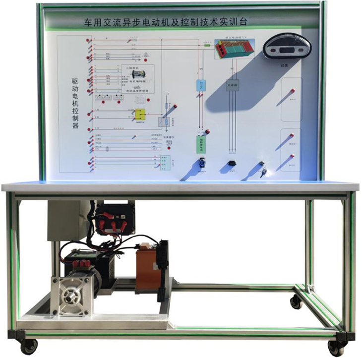 檢測控制面板(裝有各種檢測端子,1448×940mm彩色電路圖和工作原理示意圖)、組合儀表、點火開關、電機控制器、車載充電器與充電接口、DC-DC轉換器、鋰動力電池組、電動車電機(交流異步電動機)、剎車開關、檔位開關、油門控制裝置、大電流繼電器、電源總開關、急停開關、輔助蓄電池(12V45AH)、一體化全鋁合金型材搭建的移動臺架(1500×700×1700mm (帶自鎖腳輪裝置,帶安裝檢測端子的原理面板,面板1448×940mm)、設備操作說明書。